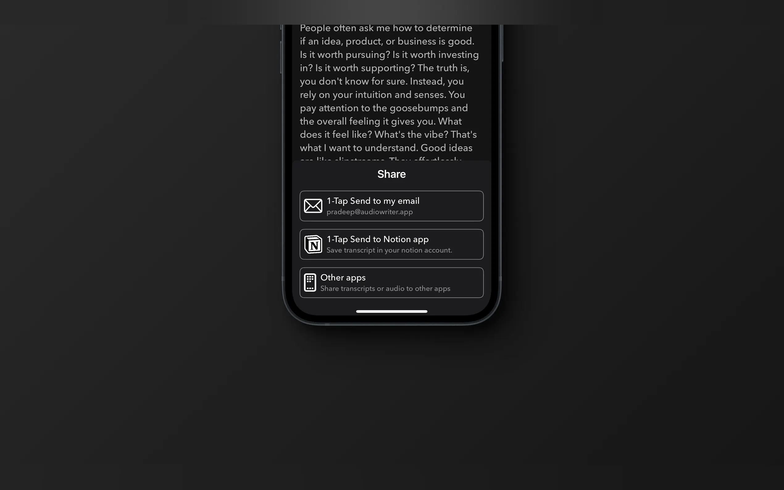 For the Content Creator: Stop staring at a blank page. Record your initial thoughts for a blog post or video, and let Audio writer provide a clean, structured draft. From there, use the repurposing tools to generate social media posts to promote your new content, all from the same original recording.