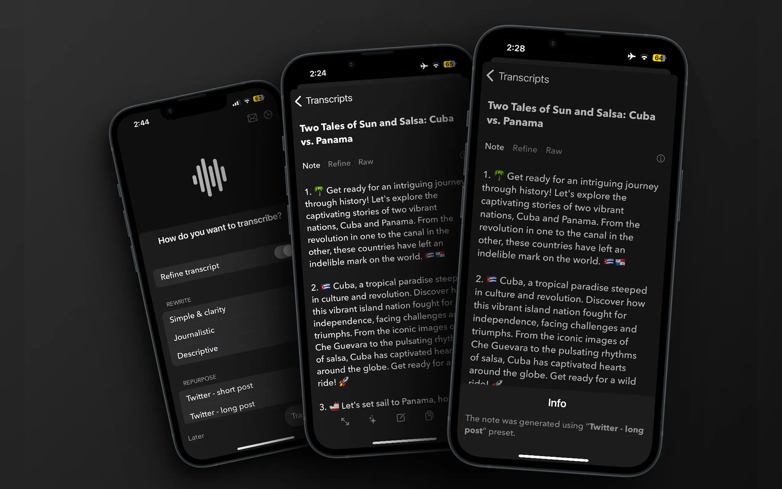 🎨 Versatile Rewriting & Styling Shape your raw transcript into precisely the content you need. With a single tap, you can rewrite your text in various professional or creative tones, mimic the style of famous authors, or apply your own custom prompts. This feature turns a simple voice note into a final draft.