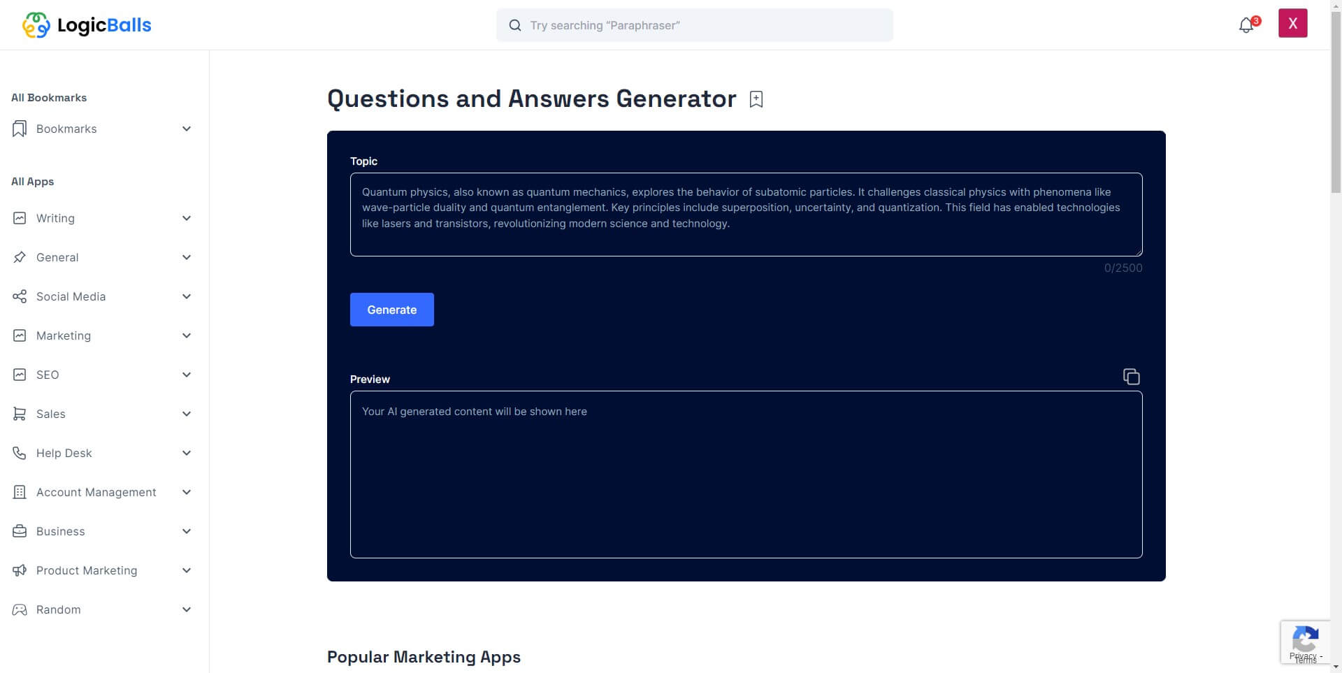 LogicBalls, a groundbreaking AI tool, redefines content creation with over 120+ apps covering a plethora of domains. Its tailored question generation templates cater to diverse content needs, offering a blend of creativity and precision. Yet, the occasional lack of human touch in the AI-generated questions reminds us of the balance needed between technology and human ingenuity.