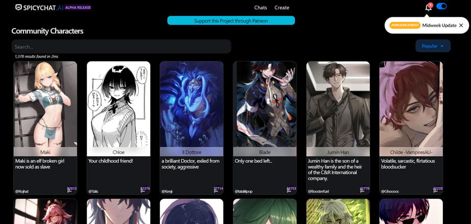 - SpicyChat AI: This fully unfiltered web chatbot offers unrestricted access. Run by a single individual, SpicyChat AI provides a free chat option and allows the use of your own API key. Users can also support the platform on Patreon for additional benefits.