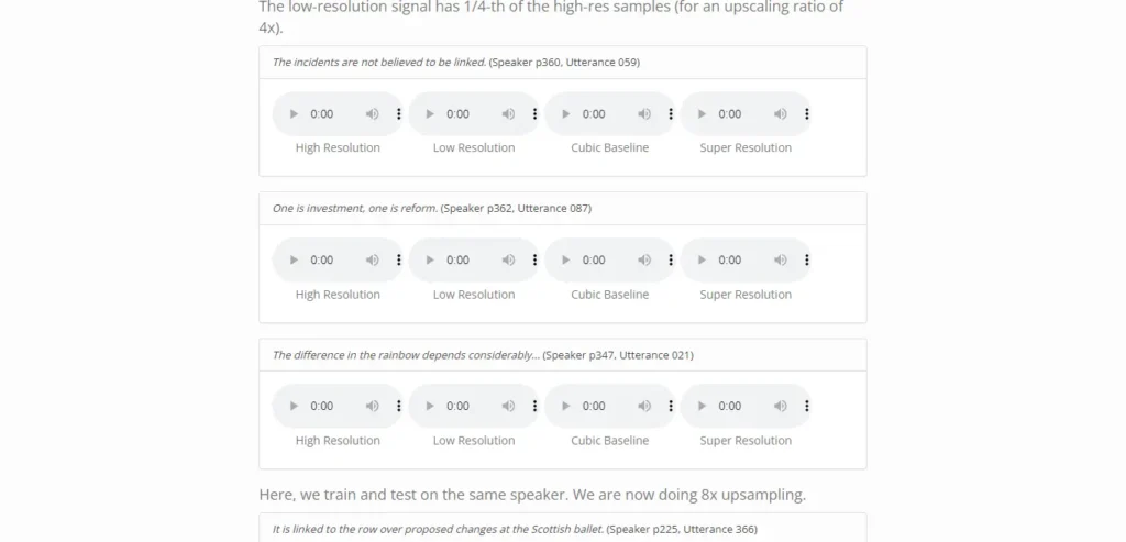 Audio Super Resolution is a free tool that improves audio quality by teaching neural networks to add additional samples to audio signals. It uses advanced algorithms like convolution, dropout, and non-linearity to enhance the audio. The AI Audio Enhancer consists of downsampling and upsampling blocks, where each block performs convolution, dropout, and nonlinearity to fix low-resolution audio and provide a superior listening experience. Overall, this innovative application utilizes AI-driven processes to enhance audio signals and provide users with a better audio quality.