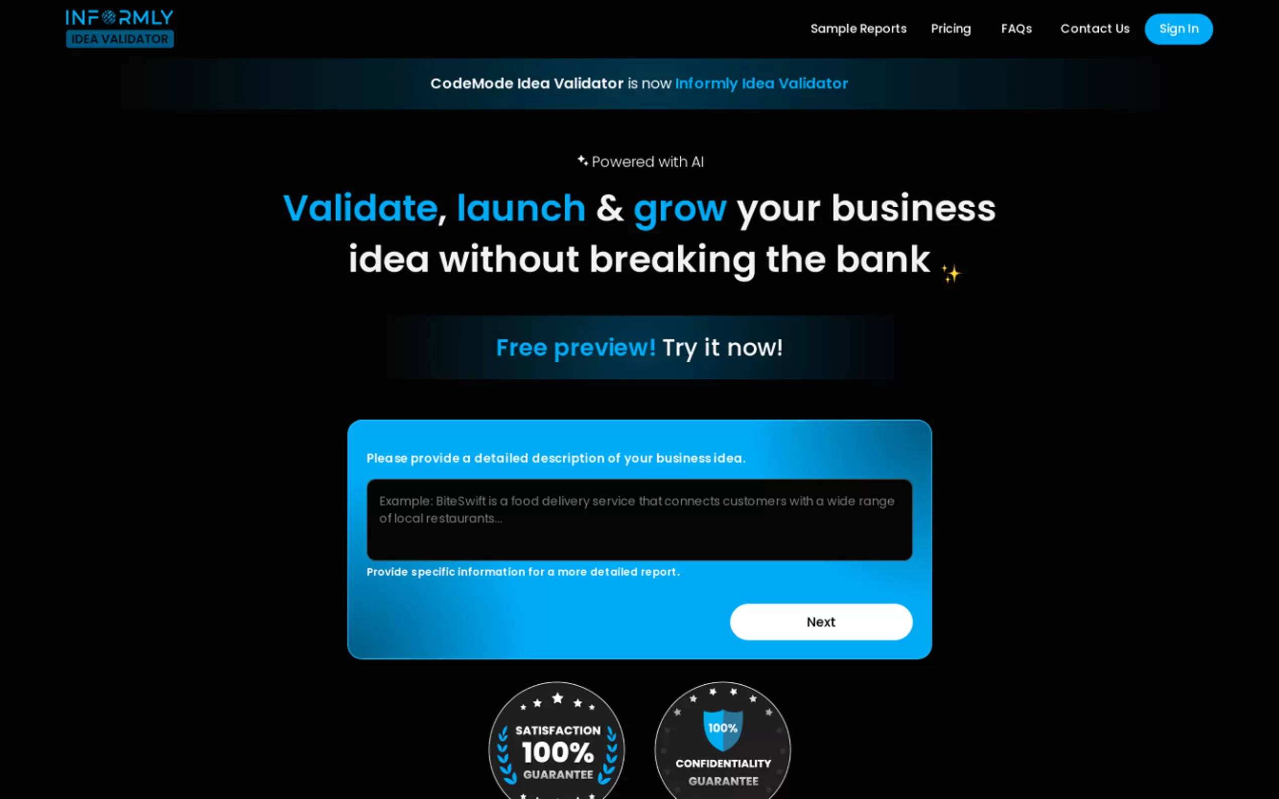 The Informly Idea Validator offers a fast, insightful, and comprehensive way for entrepreneurs to validate and develop their business concepts. By combining AI analysis with real-time data, it provides detailed reports and expert guidance, helping you gain clarity and confidence. Explore how Informly can provide the insights you need to validate, launch, and grow your business idea.
