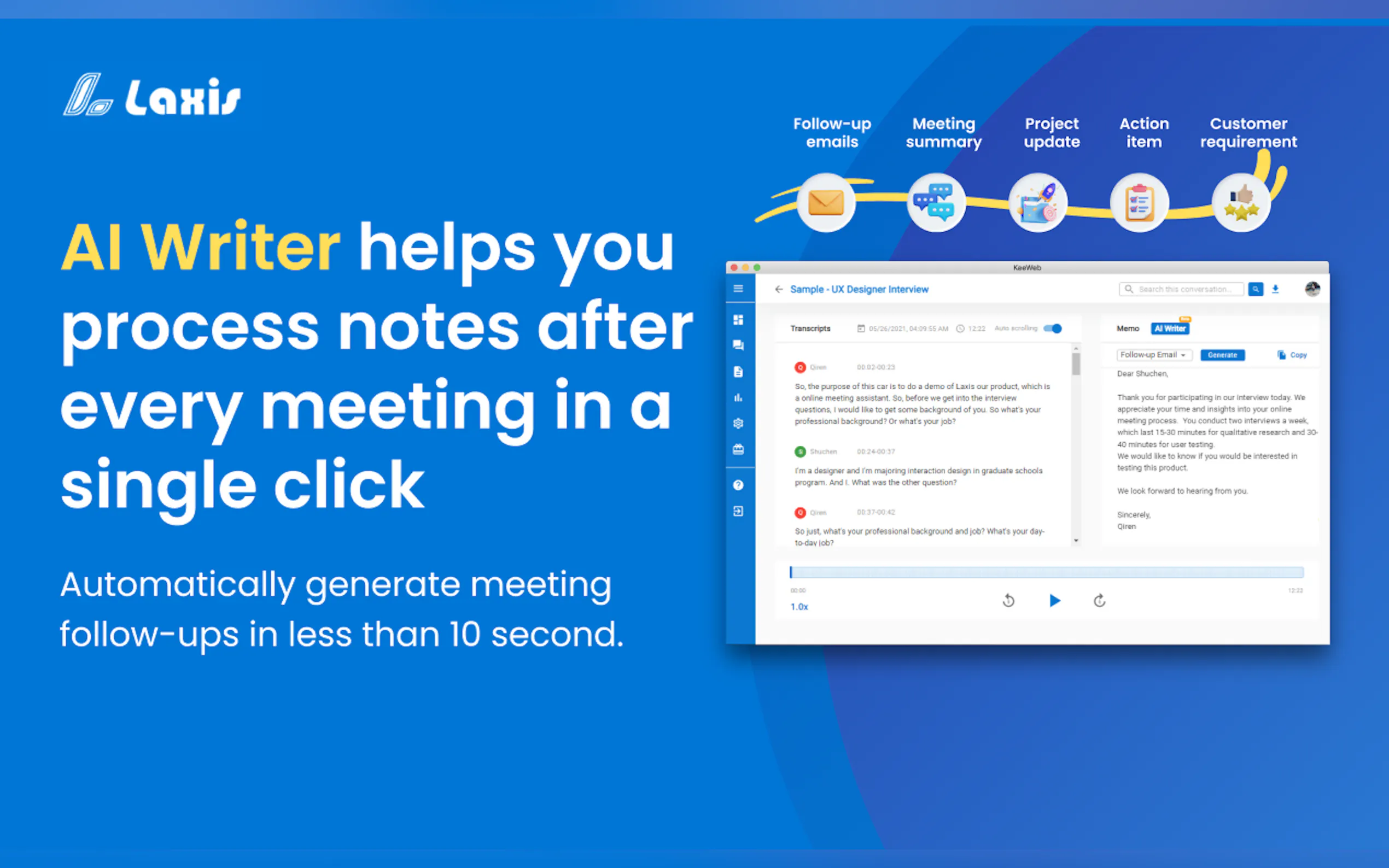 For Founders and Consultants: Your time is your most valuable resource. Laxis automates customer outreach and captures every critical detail from client meetings. It automatically generates summaries and action items, saving you hours of administrative work each week and ensuring no commitment or opportunity is missed.