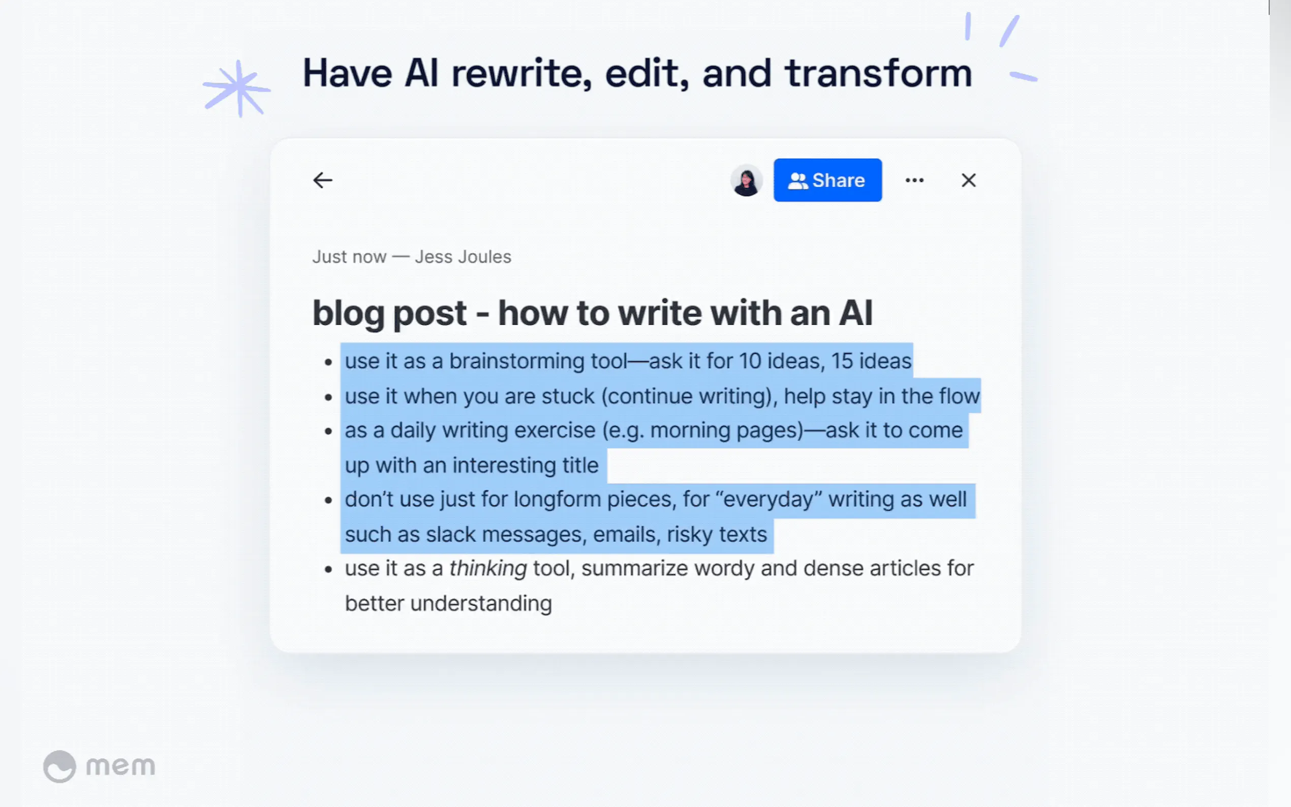 Accelerate Research & Content Creation: As you gather information from the web or brainstorm ideas, Mem actively connects related concepts and past research using Heads Up. This enables you to quickly synthesize information, answer complex questions about your notes, and draft content more efficiently.