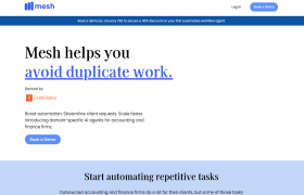 Running an accounting or finance firm means juggling endless client requests, manual data entry, and repetitive tasks that eat into your team’s productivity. Enter Mesh—a domain-specific AI assistant designed to streamline your workflows, reduce manual effort, and help you focus on what truly matters: delivering exceptional client service. Backed by Y Combinator, Mesh is built to help modern accounting and finance teams scale faster without increasing overhead.