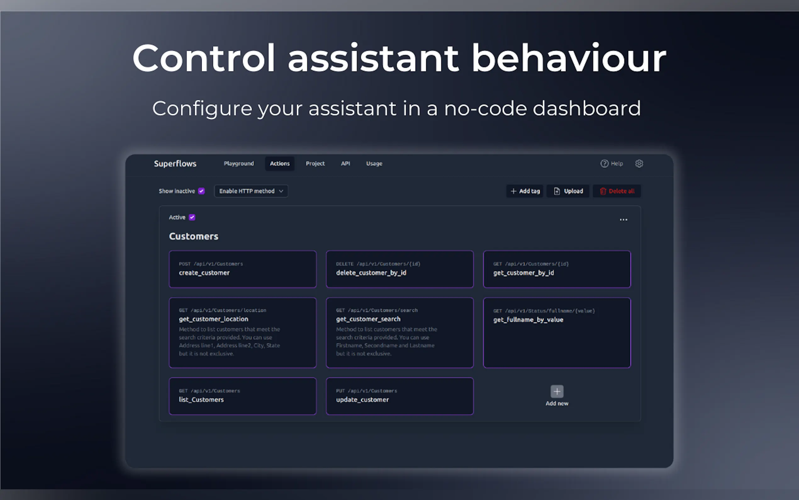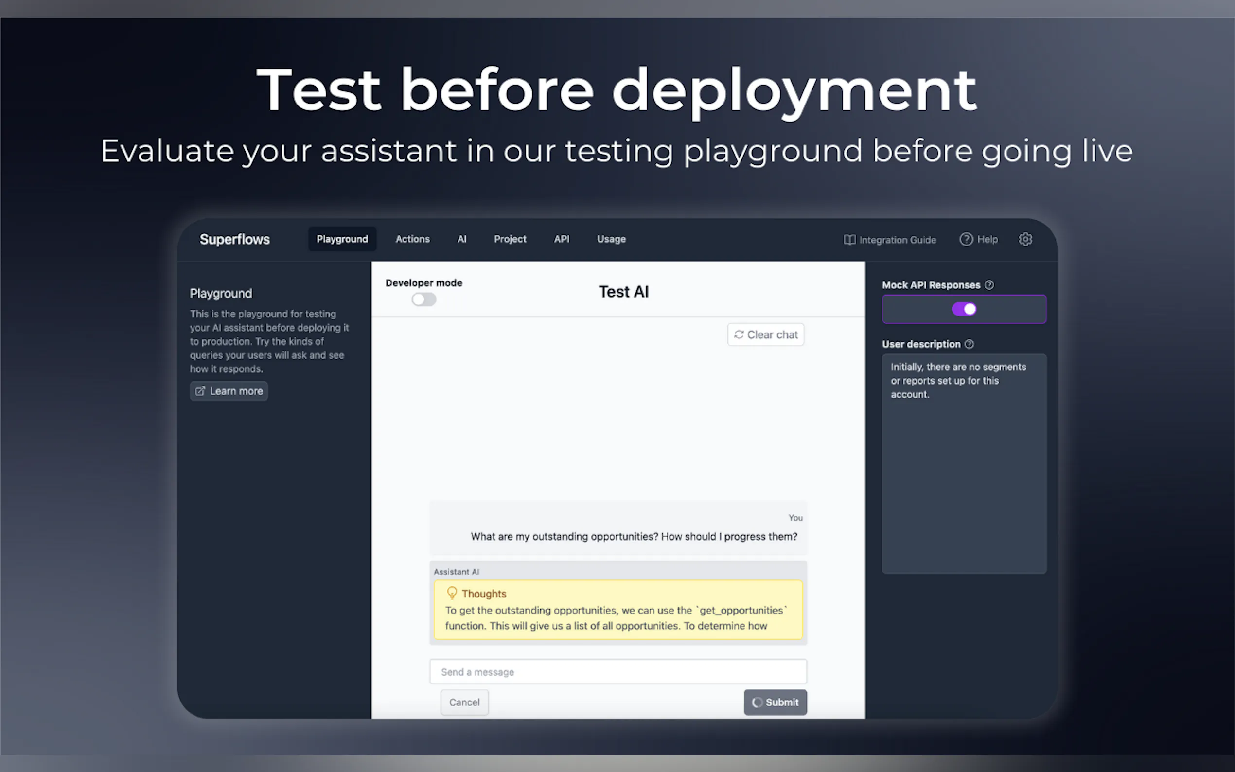 🎛️ Comprehensive Developer Control Dashboard: Configure, test, and fine-tune your AI assistant's behavior in a dedicated dashboard environment. Upload API specs (like OpenAPI), define available actions, test interactions in a playground (with developer mode and mock API options), and approve answer formats to ensure reliability and maintain control before going live.