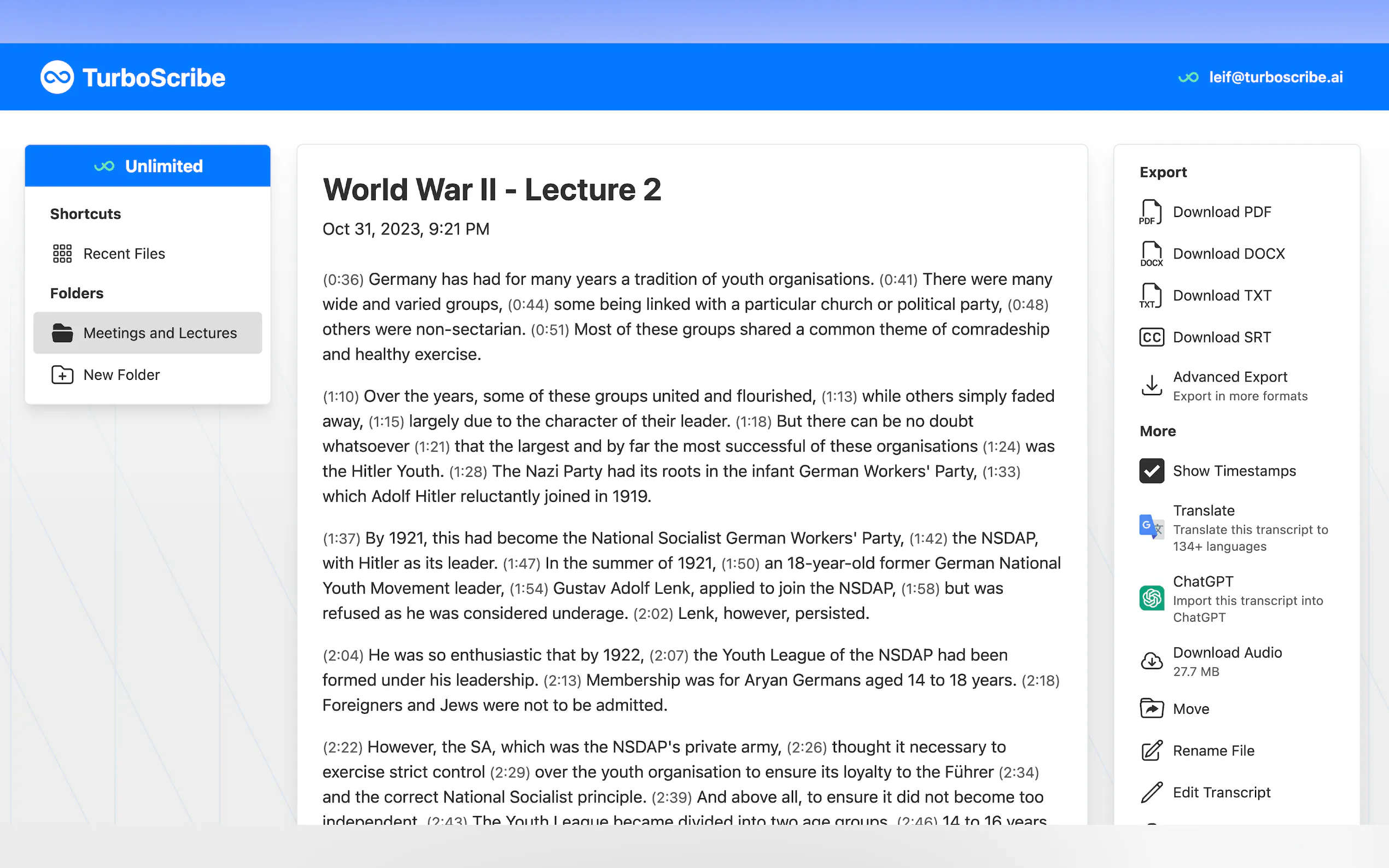 Accelerate Research & Analysis: For academics and researchers, TurboScribe quickly transcribes qualitative data from interviews, focus groups, or field recordings. This capability saves thousands of hours, enabling faster data analysis and more efficient knowledge extraction from spoken sources.