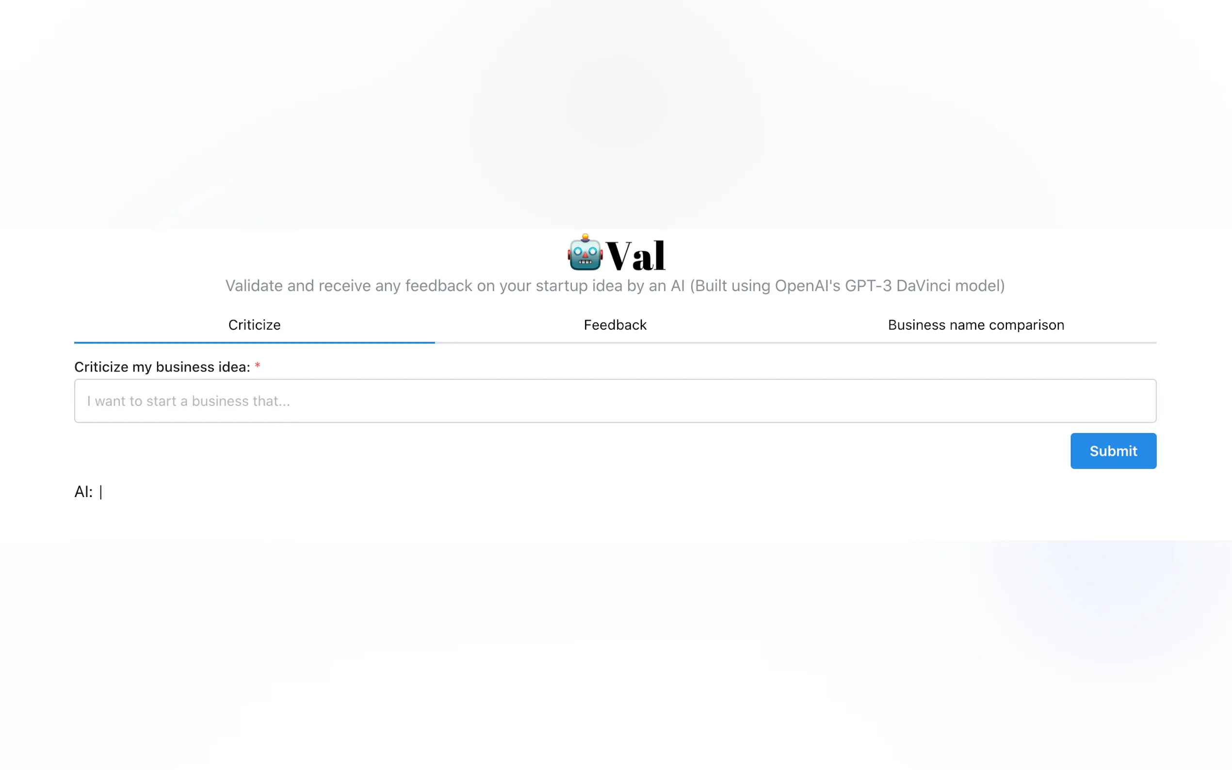 🧠 Startup Idea Generation: If you're starting from scratch, Val can help. Answer a few simple questions, and its AI generator can create up to 10 potential business ideas for you to explore and then validate with Val.